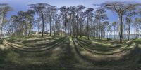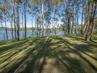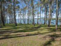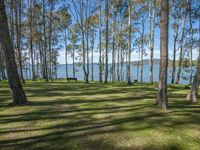 A serene view of a lush green landscape with a sparkling lake and tall trees on a sunny day
