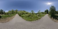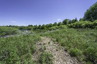 A picturesque view of the lush green landscape in Ontario, Canada, with vibrant vegetation, trees, and grass covering the ground. The clear sky and sunlight create a beautiful scene in this open space.