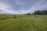 A scenic view of a lush green landscape in a rural countryside with open fields, grassy surfaces, and trees under a clear blue sky.
