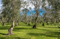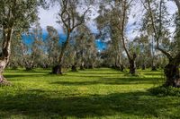 A scenic view of the lush green landscape in New Zealand's North Island, featuring a forest, open grassy spaces, and a clear blue sky with fluffy white clouds. This picturesque destination offers ample opportunities for outdoor activities and recreation.