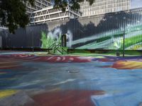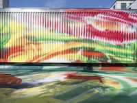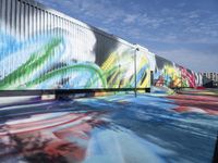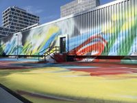 A hinterhof in the heart of Berlin, Germany, featuring a vibrant mix of modern art, graffiti, and urban design. The blue sky and clear light create a vibrant backdrop for this multifaceted urban landscape, as the iron fence and concrete roads lead the eye down the straight road to the metropolitan area beyond.