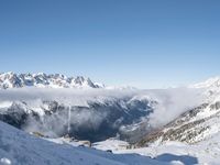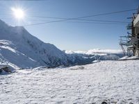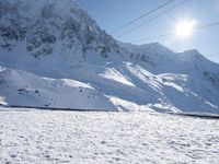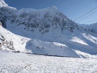 An overview of the majestic Mont Blanc, the highest mountain in the Alps, located in the foothills of the French Alps in Europe. The sunny day illuminates the snowy surface and clear sky, offering a beautiful view of the Aiguille du Midi in the background.