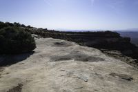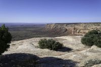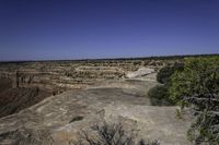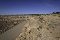 Aerial view of the stunning red rock formations and canyonlands in Utah, USA. The clear sky and elevated plateau create a breathtaking vista of the Moki Dugway, with its dirt and gravel road winding through the rugged terrain. The rock walls, cobble stone formations, and vegetation add to the natural beauty of this open space.
