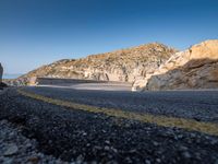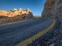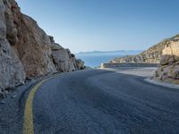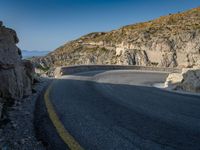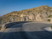 A sun-filled day showcases the elevated road, hard shadows, and armco barrier along the coastal mountain range of Mallorca, one of the Balearic Islands in Spain, Europe.