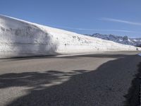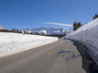 A straight road stretches down the mountain pass surrounded by snow-capped mountains, glacial landforms, and a clear blue sky in Mammoth Lake, California, USA during a bright winter day.