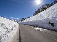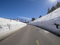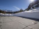 A winding mountain road in Mammoth Lake, California, USA, on a sunny winter day. The alps, snow, and mountain range are visible with a clear sky and sunshine. Trees and infrastructure line the highway, providing a stunning mountain landscape.