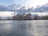 A panoramic view of the Manhattan skyline at dawn, with boats passing through a factory-filled harbor, a bridge spanning a river, and a power station in the background. This coastal cityscape illustrates the urban energy and water resources of this metropolitan area in the United States.