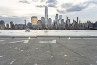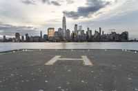 A dawn panorama of Manhattan, New York City, USA, featuring a skyline of skyscrapers, a human settlement of concrete and asphalt, calm ocean and river reflections, and a pier, jetty and helipad providing transport on the shore.