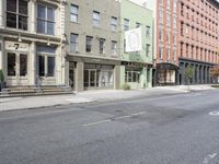 A classic architecture shop storefront stands on a residential street in Manhattan, New York. Automobiles drive on the asphalt lane while people enjoy the public spaces of the city in the bright day.