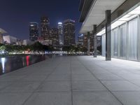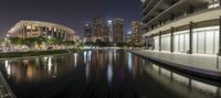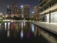 A skyline of skyscrapers and high-rise buildings with a reflection in a lake, illuminated by artificial light and street lamps, in the coastal city of Los Angeles, California, USA. The urban infrastructure consists of roads, walkways, open spaces, and a mix of residential and commercial buildings with glass facades, trees, and a fixed link dome structure in the downtown area.