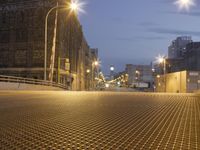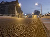A classic architecture skyline of the metropolitan area of Chicago, Illinois, USA is illuminated by the artificial light of a street lamp, with a road surface of concrete, asphalt and metal providing a thoroughfare over the bridge and a river below. The clear sky and low cloud provide a backdrop for the human settlement and infrastructure below.