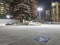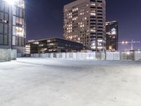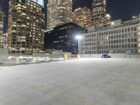 A downtown skyline of a metropolitan area with skyscrapers on a winter night illuminated by artificial light on a concrete and asphalt surface with a parking garage in the foreground.
