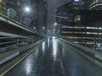 A view of Los Angeles, California, USA at night, including its modern architecture, bridges, infrastructure, and highway entrance. The cityscape reflects in the wet road surface, illuminated by artificial light, creating a unique atmosphere straight down the road.