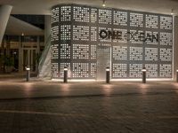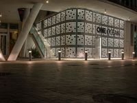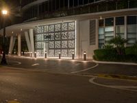 A view of Miami Beach, Florida, USA, illuminated by the artificial light of the city. The paver driveway leads to a modern residential home, hotel, or house, surrounded by urban design and neon light. The open space road is dark with street lights, and asphalt surface.