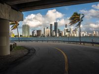 view of downtown miami from beneath highway bridge on a sunny day with palm trees in the distance