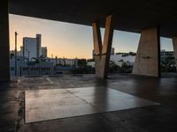 A parking deck in Miami, Florida, USA, is illuminated at the break of day, as the urban design of the cityscape is revealed on the asphalt surface.