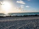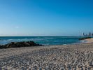 A straight road leads down to the beach, revealing a beautiful landscape of Miami Beach, Florida, USA. The coastal shore, ocean, sand, cloud and city create a stunning urban design that is unique to this day.