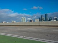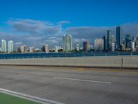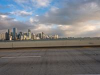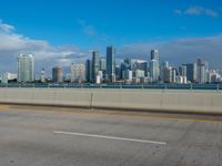 A profile view of the asphalt road in Miami Beach, Florida at the break of day. The coastal cityscape is seen with the urban design, ocean, and clouds in the distance.