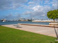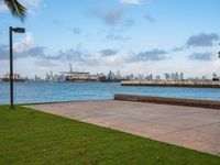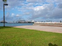 A view of the cityscape of Miami Beach, Florida at the break of day. The road stretches through the urban design, with concrete structures and clouds above.