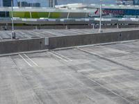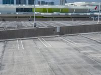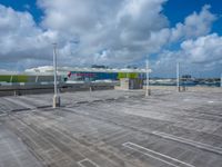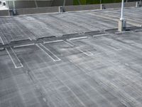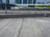 A top down view of an urban design in Miami Beach, Florida, USA, from an elevated parking deck. The asphalt cityscape, parking lot, and clouds are visible from the high position.