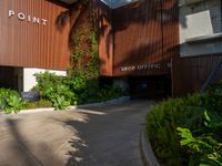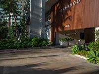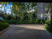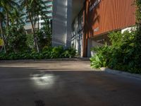 A sunny day in Miami Beach, Florida, USA reveals a residential area with a parking deck and a concrete street, casting a hard shadow on the urban design below.