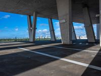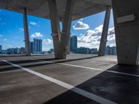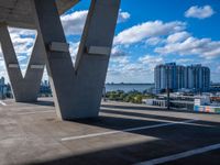 A profile of the Miami Beach skyline in Florida, USA, featuring skyscrapers, concrete surfaces, and a parking lot on a sunny day.