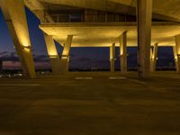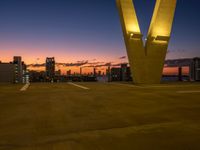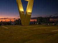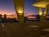 The Miami Beach skyline seen from the perspective of a parking lot in Florida, USA. Concrete surfaces and artificial light reflect the break of day, creating an urban cityscape of skyscrapers and open urban design.