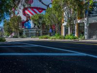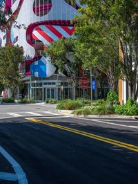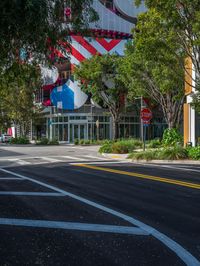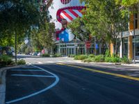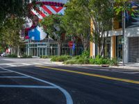 A busy urban street in Miami Beach, Florida, USA featuring modern architecture, storefronts, and a hard shadow cast on the asphalt roadway.