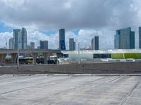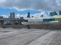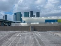 A view of the cityscape of Miami Beach, Florida, USA, featuring a parking deck, parking lot, and asphalt surface straight down the road.