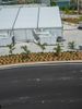 an empty street is next to two small parking spaces in front of some buildings and palm trees