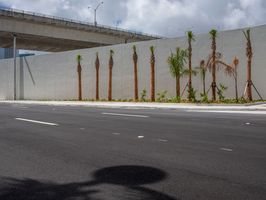 a man riding a skateboard down the side of a street near palm trees and shrubs
