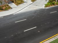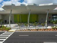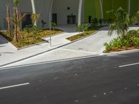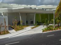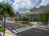 From an elevated position, a top down view of the urban design of Miami Beach, Florida, USA is seen. A road crossing is seen with asphalt and greenery, and a palm tree in the foreground. Bright blue clouds can be seen in the day sky in the background.