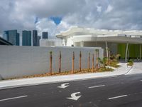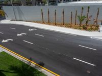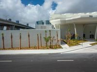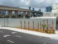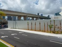 An elevated view of the asphalt road, bridge, and palm trees in the city of Miami Beach, Florida, USA, on a sunny day.