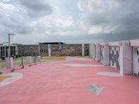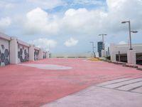 An open space in the city of Miami Beach, Florida, USA, with an urban design featuring an asphalt surface and parking lot below a cloudy day sky.