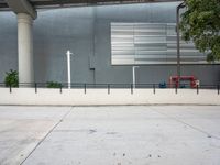 A busy office building in the Miami Beach business district of Florida, USA. A concrete street stretches out into the city on a sunny day.