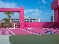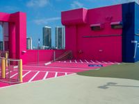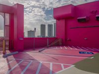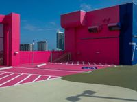 A view of the Miami city skyline and an urban design concrete parking lot in Miami Beach, Florida, USA, with skyscrapers, shadows, clouds, and rooftops illuminated by the day light.