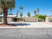 A residential villa in the Sonora Desert of Palm Springs, California, showing a modern architecture driveway entry surrounded by a parking lot of concrete, asphalt, and palm trees, on a clear day.