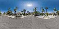 The clear sky above the Sonora Desert provides a backdrop for this mid century modern residential villa in Palm Springs, California, USA. The gravel and asphalt surface of the road creates a contrast with the nearby palm trees.
