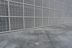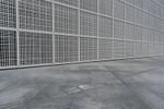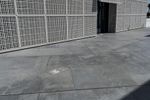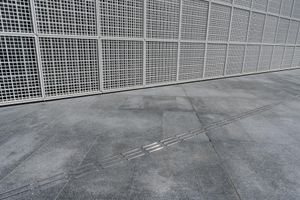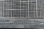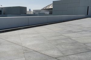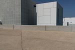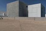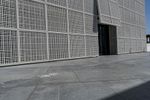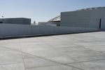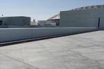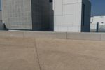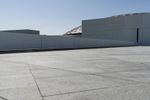 A composite material walkway leads to the facade of a modern building with a concrete roof in Abu Dhabi, United Arab Emirates. The Louvre Abu Dhabi stands in the open space near the sea, surrounded by asphalt roads and clear skies.