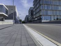the empty city street in front of a modern office building is shown in this image