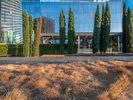 A view of a modern office building in Barcelona's business district on a clear sky day. The urban design and straight road create a striking composition with a hard shadow.