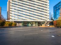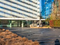 A clear sky shines over a modern office building in Barcelona's bustling business district.