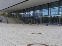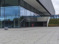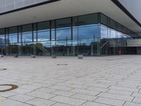 A view of a modern architecture building in the city of Berlin, with glass walls reflecting the urban design and the gloomy grey sky.