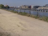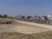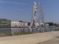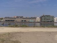 A view of the modern architecture of Berlin, Germany, with a clear sky and the natural environment of the shore, trees and vegetation in the background.
