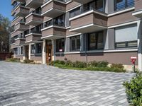 A residential area in Berlin, Germany is seen from a high angle with a clear sky in the background. The vegetation, architecture, and infrastructure of the city are visible, including a building with a modern design, a public space, a road with a tree-lined curb, a house lined with windows, and a road surface of asphalt in the foreground. This photo captures a typical day in a vibrant urban neighborhood.