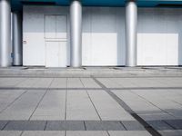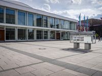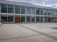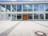 A business district of Berlin, Germany, is seen from a Hinterhof courtyard, with a modern office building, open plaza, and paved surface in the foreground. The bustling city and European architecture come together in this urban profile of day-to-day life.