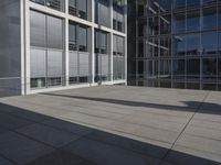 A view of an office building in the metropolitan area of Berlin, Germany, displaying modern architecture with concrete facades, glass windows, and a walkway lined with tiles. The headquarters of the German Parliament is located in this business district, with a design that includes glass walls and open spaces, as well as the light wall-flooring combination. It's a sunny day in Europe's leading business hub.