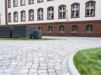 A view of a modern architectural building, estate, and public space in Berlin, Germany. A cobble stone driveway is visible in the foreground, with a grassy lawn, trees, and brickwork walls in the background. This urban business district is situated in Europe, and is full of open spaces and properties.