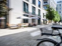 A snapshot of a busy city street in Berlin, Germany with modern architecture, mixed-use properties, residential areas, office buildings, shops, restaurants, and coffeehouses. The yellow line in the road, trees, cobble stone, and motion blur of a vehicle add to the vibrant cityscape. A perfect example of urban design in Europe.