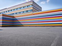 A view of the modern architecture in Berlin, Germany, with its vibrant yellow patterns and multicolored murals, against a clear blue sky.